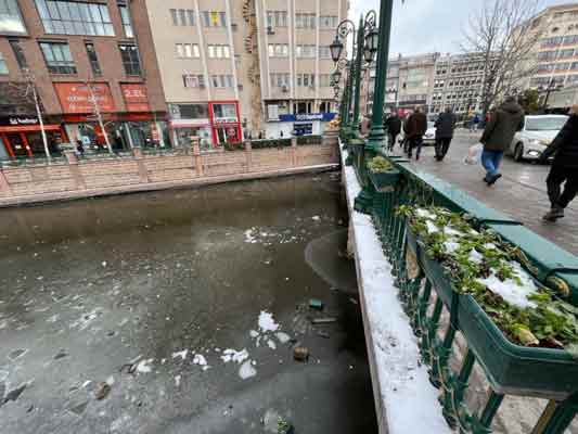 Eskişehir’de yer yer buz tutan Porsuk Çayı’nın üzerine atılan ve suya batmadığı için görülebilen çöpler, suyun akışkan olduğu dönemlerde çayın ne boyutta kirletildiğini, ancak pek de fark edilmediğini ortaya koyuyor. Son olarak köprüde süs amaçlı asılı duran saksıların buzlu zemine atılması adeta ‘pes’ dedirtti.