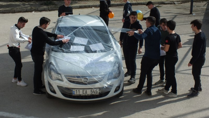 Bilecik'te, Yavuz Selim Mesleki ve Teknik Anadolu Lisesi öğrencileri, 42 yıllık meslek hayatını bitirerek emekliye ayrılan öğretmenlerini, yaptıkları şakayla uğurladı.