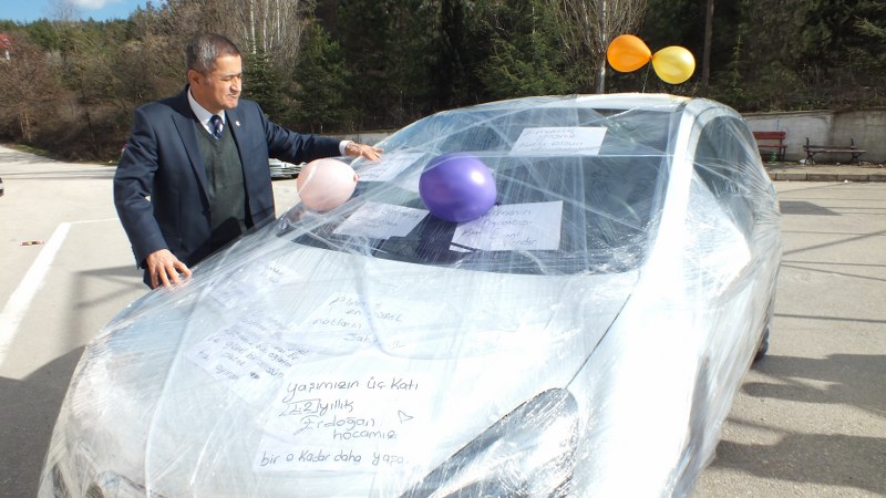 Bilecik'te, Yavuz Selim Mesleki ve Teknik Anadolu Lisesi öğrencileri, 42 yıllık meslek hayatını bitirerek emekliye ayrılan öğretmenlerini, yaptıkları şakayla uğurladı.