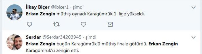 TFF 2’nci Lig play-off final karşılaşmasında Fatih Karagümrük, Sakaryaspor’u Selçuk Alibaz ve Ahmet Aras’ın golleriyle 2-0 yenerek Spor Toto 1’inci Lig’e yükseldi. Maçın yıldızı Eskişehirspor'dan tanıdığımız Erkan Zengin oldu Erkan Zengin'in performansı sosyal medyada kısa zamanda en çok konuşulan konu oldu. İşte Erkan Zengin hakkında Twitter'da yazılanlar. Kaynak: Fanatik