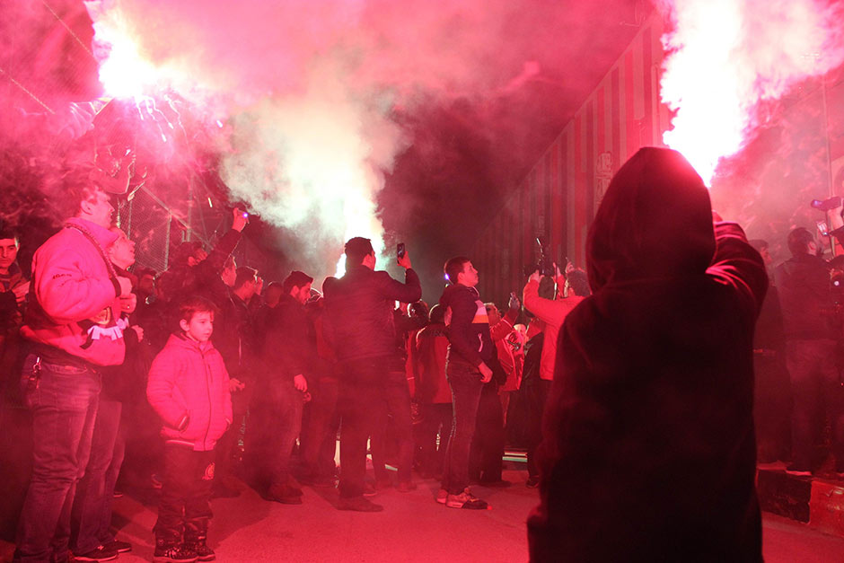 Yaklaşık bin Eskişehirspor taraftarı, tesislere gelerek yaktıkları meşalelerle şampiyonluk şarkıları söyledi.