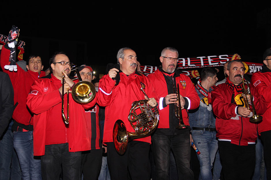 Yaklaşık bin Eskişehirspor taraftarı, tesislere gelerek yaktıkları meşalelerle şampiyonluk şarkıları söyledi.