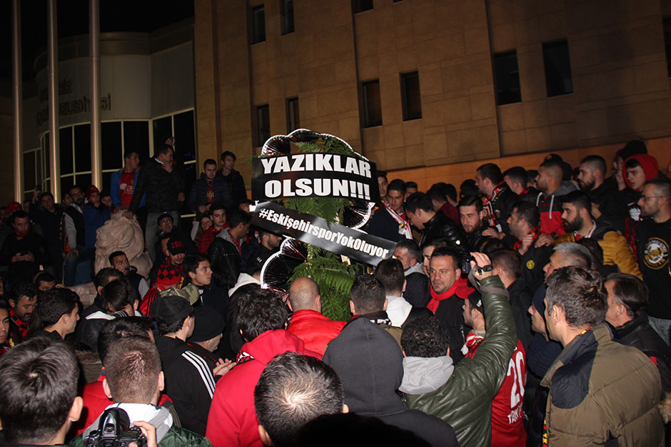Eskişehirspor taraftarı takımın içerisine düştüğü durumu protesto ederek, Büyükşehir Belediyesi önüne siyah çelenk bıraktı.