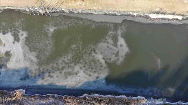 Eskişehir’de gece saatlerinde hava sıcaklığının eksi 10 dereceye kadar düşmesiyle birlikte yüzeyi buz tutan Porsuk Çayı drone ile havadan görüntülendi.
