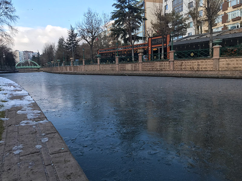 Eskişehir’de etkili olan soğuk hava, porsuk çayının yüzeyini yeniden dondurdu.
