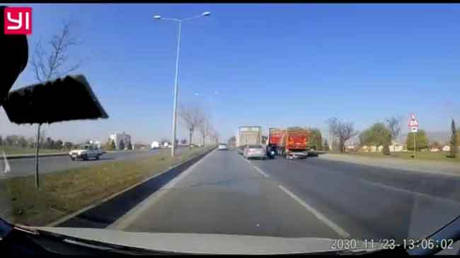 Eskişehir’de, seyir halinde iken iki kamyonun arasında kontrolünü kaybederek kaza yapan motosikletdeki gençlerin kurtulma anı araç kamerasına yansıdı.