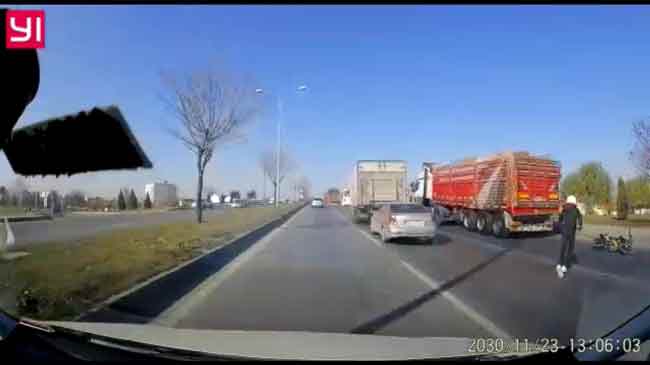 Eskişehir’de, seyir halinde iken iki kamyonun arasında kontrolünü kaybederek kaza yapan motosikletdeki gençlerin kurtulma anı araç kamerasına yansıdı.