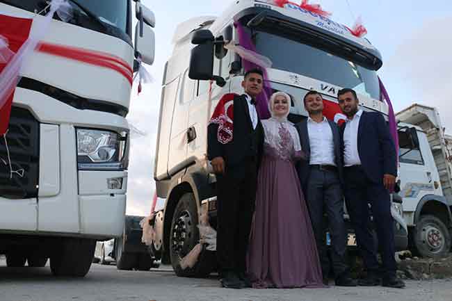 Taşımacılık sektöründe çalışan damat Tevfik İleri, ailesine ait 3 adet tır ile gelin Hayriye İleri’yi baba evinden almaya gitti. Kurdeleler, bayraklar ve balonlar ile süslenen tırlar yolda renkli görüntüler oluştururken farklı konvoyu görenler de şaşkınlıklarını gizleyemedi.