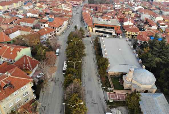Eskişehir'de kısıtlamayla boş kalan tarihi evleriyle meşhur Odunpazarı, havadan görüntülendi.