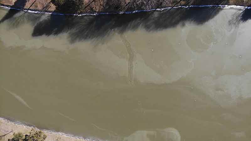 Soğuk havanın etkisiyle bir kısmı buzla kaplanan Porsuk, dron ile havadan görüntülendi. Buzun üzerinde görülen cam şişe, plastik atıklar ve araba güneşliği gibi malzemeler ise dikkat çekti.