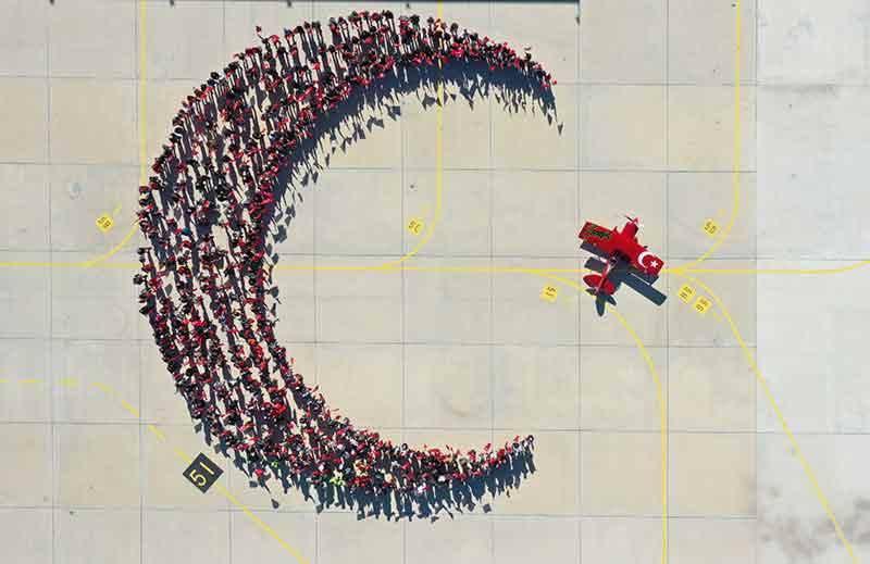 Sivrihisar Havacılık Merkezine ait tesislerdeki geleneksel "Cumhuriyet Fotoğrafı" etkinliğinde akrobasi uçağının etrafında hilal şeklinde dizilen katılımcıların oluşturduğu Türk bayrağı dronla görüntülendi