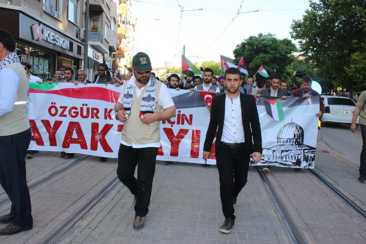 Eskişehir'de bir grup vatandaş ABD'nin İsrail Büyükelçiliğini Kudüs'e taşıması ve İsrail askerlerinin Filistinli 59 kişiyi katletmesi sebebiyle gıyabi cenaze namazı sonrasında yürüyüş gerçekleştirdi.