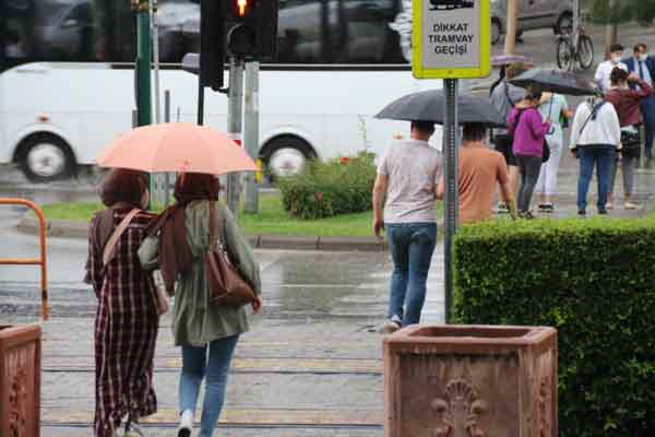 Eskişehir’de aniden bastıran şiddetli yağmur kent merkezini etkisi altına alırken, cadde ve sokaklar adeta göle döndü.