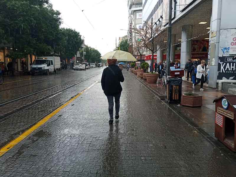 Eskişehir’de aniden bastıran kısa süreli sağanak yağmurdan nasıl kaçacağını bilemeyen vatandaşlar koşturarak kapalı yerlere sığınmaya çalıştı.