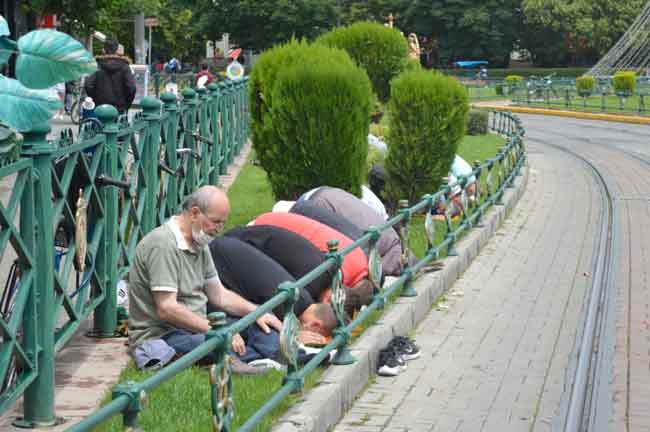 Ancak Eskişehir’de Cuma namazından biran önce aniden yağan yağmur namaza gelen vatandaşlara zor anlar yaşattı. Eskişehir Valiliği tarafından belirtilen açık alanlarda namaz kılan vatandaşlar yağan yağmur dolaysıyla ıslak zeminlerde ibadetlerini yaptılar.