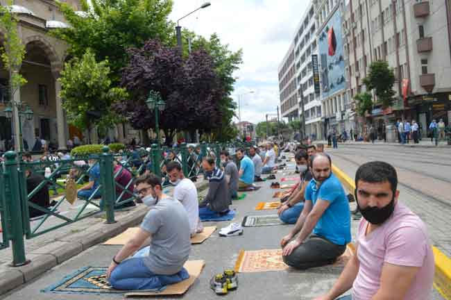 Eskişehir’de bugün Cuma namazından hemen önce aniden yağan yağmur, vatandaşları ıslak zeminin üstünde namaz kılmak zorunda bıraktı.