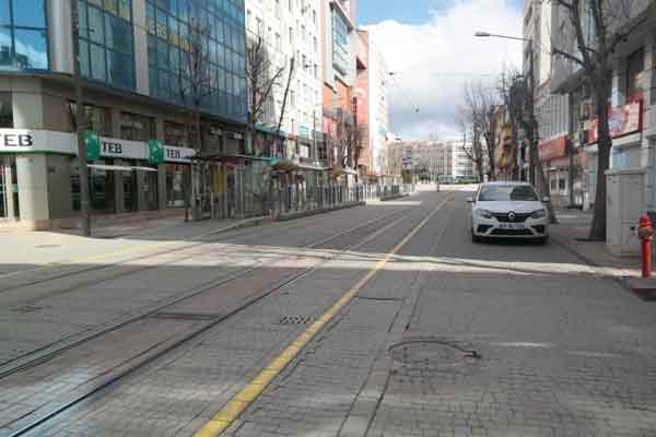 Kısıtlamasının ikinci haftasında da sessizliği bürünen Eskişehir caddeleri boş kalırken, sokakta yaşayan hayvanlar güneşli havanın tadını çıkardı.