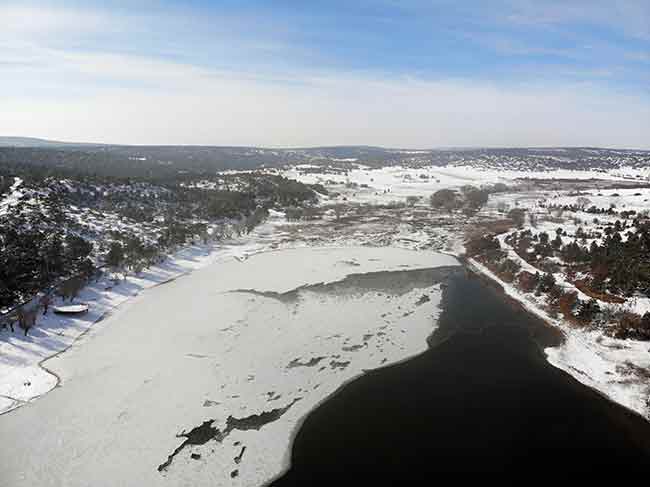 Öte yandan göletin daha önceden kurumuş vaziyette olan kısımlarının ise şimdi kar yağışının etkisiyle buz tutması dikkat çekti.