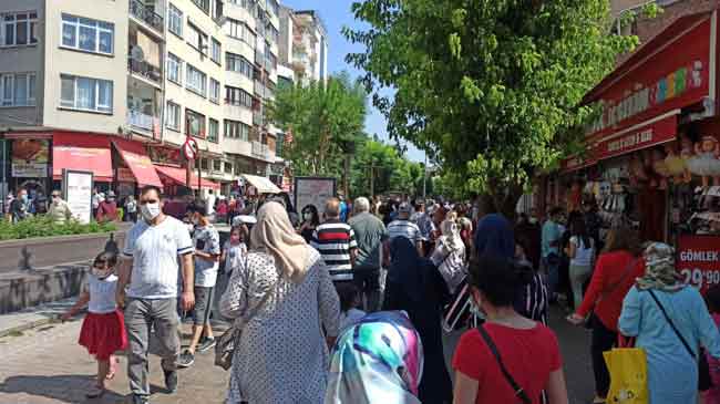 Kurban Bayramı’na sayılı günler kala vatandaşların alışverişi için çıktıkları caddelerde sosyal mesafe ve maske kuralına uymadıkları görüldü.