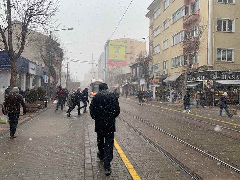 Eskişehir’de öğleden sonra rüzgârla birlikte aniden bastıran yoğun kar yağışı, vatandaşlar arasında şaşkınlıkla karşılanırken, kent merkezinde ilginç görüntüler oluştu.