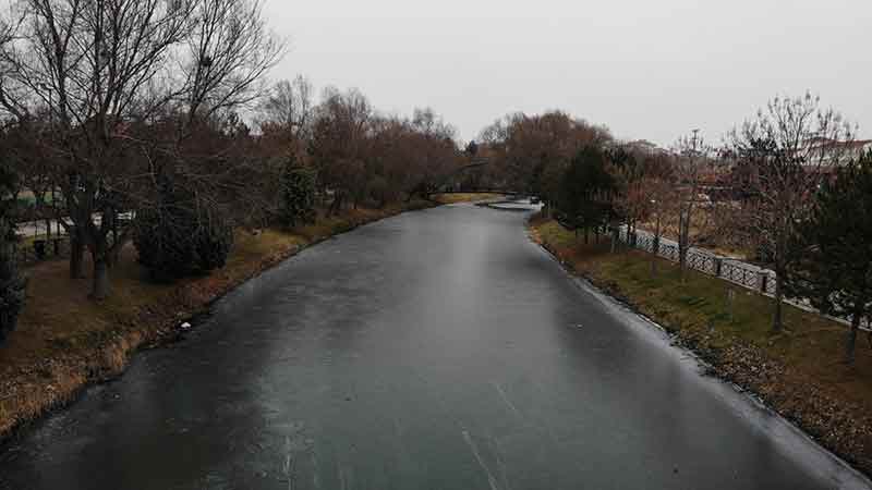 Eskişehir’de soğuk hava ve şiddetli ayaz nedeniyle kent merkezinden geçen Porsuk Çayı’nın yüzeyi buz tuttu.