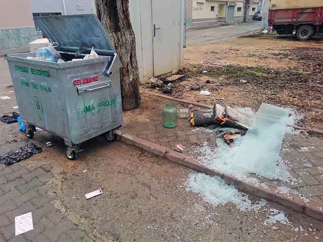 Eskişehir Güllük Mahallesi’nde bulunan Kiraz ve Yüzügüllü sokaklarının kesişimindeki çöp konteynırının etrafındaki kırık cam parçaları, görenleri tedirgin etti.