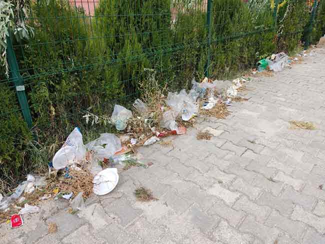 Kaldırım boyunca devam eden yoğun çöp birikintileri, görenleri endişelendiriyor.