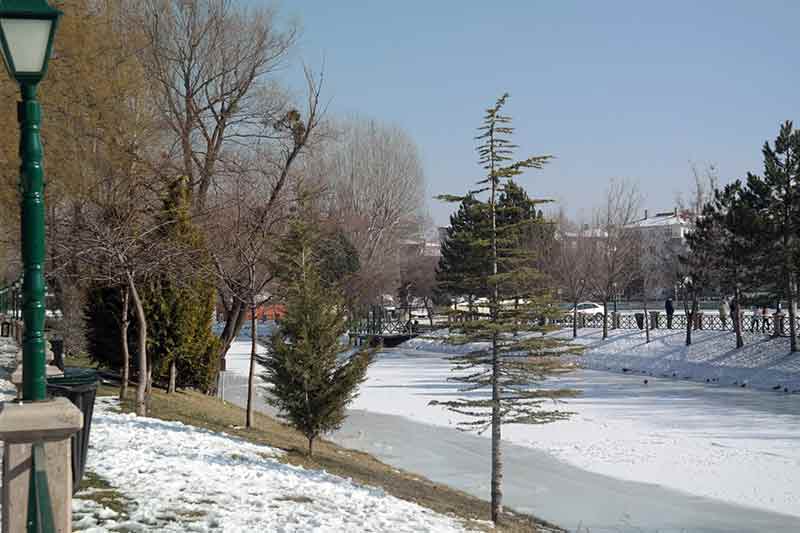 Eskişehir’de şiddetli soğukların etkisiyle yüzeyi donan Porsuk Çayı’nda yaklaşık 2 haftadır buz tabakası erimedi.