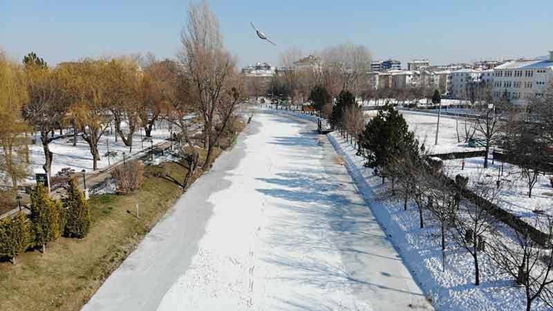 Şehrin en çok ziyaret edilen yerlerinden Kanlıkavak Parkı’nı da ikiye ortadan ikiye bölen Porsuk Çayı’nın buz tutmuş hâli drone ile havadan görüntülendi.