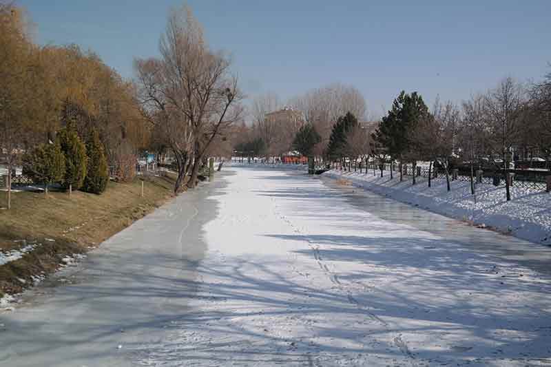 Eskişehir’de şiddetli soğukların etkisiyle yüzeyi donan Porsuk Çayı’nda yaklaşık 2 haftadır buz tabakası erimedi.