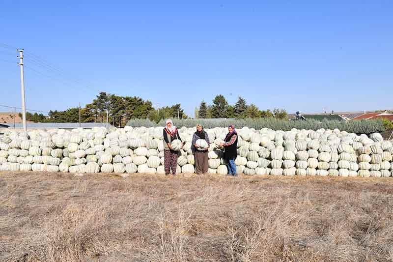 Eskişehir'in merkez Tepebaşı ilçesi Kızılinler Mahallesi'ndeki kadın çiftçiler, ata tohumlarından ürettikleri bal kabaklarını satışa sunuyor.