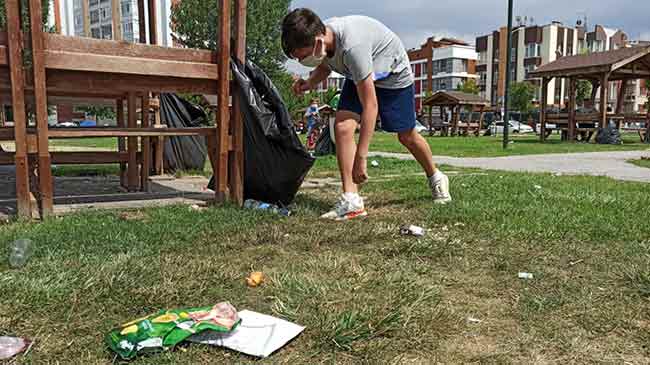 Eskişehir’de zaman geçirmek için parka gelen 13 yaşındaki Eymen Çiçek, parkı kirli görünce çöpleri topladı.