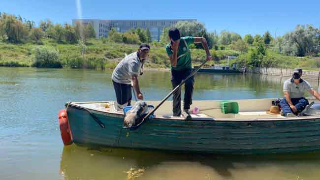 Eskişehir'deki Porsuk çayında temizlik çalışması yapan belediye ekipleri, bir poşet içinde batması için taşla birlikte suya atılmış, üzerinde yara izleri olan ölü bir köpek buldu.