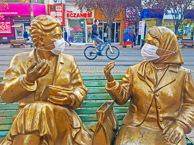 Eskişehir’de sohbet etmekte olan kadın heykellerine maske takılırken, arka planda maskesinin boynunda olduğu görülen bisikletli vatandaş, ortaya ilginç bir görüntü çıkardı