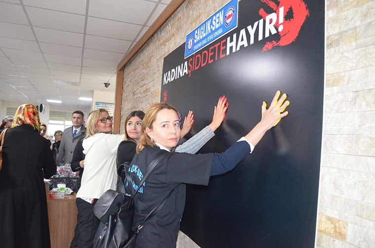 Sağlık Sen Eskişehir Şubesi Kadınlar Komisyonu üyeleri, Eskişehir Devlet Hastanesi Poliklinik girişinde hazırladıkları “Kadına Şiddete Hayır” panosuna boyalı ellerini kapıştırarak 'kadına şiddete hayır' işaretini oluşturdular.