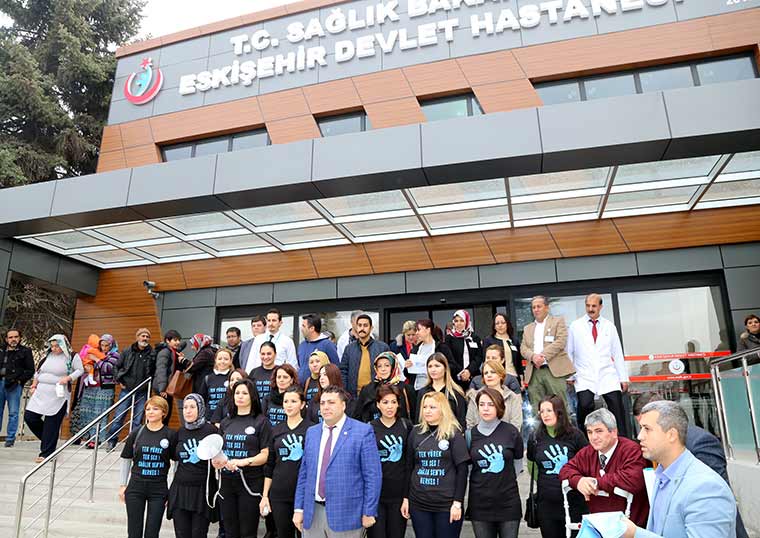 Sağlık Sen Eskişehir Şubesi Kadınlar Komisyonu üyeleri, Eskişehir Devlet Hastanesi Poliklinik girişinde hazırladıkları “Kadına Şiddete Hayır” panosuna boyalı ellerini kapıştırarak 'kadına şiddete hayır' işaretini oluşturdular.