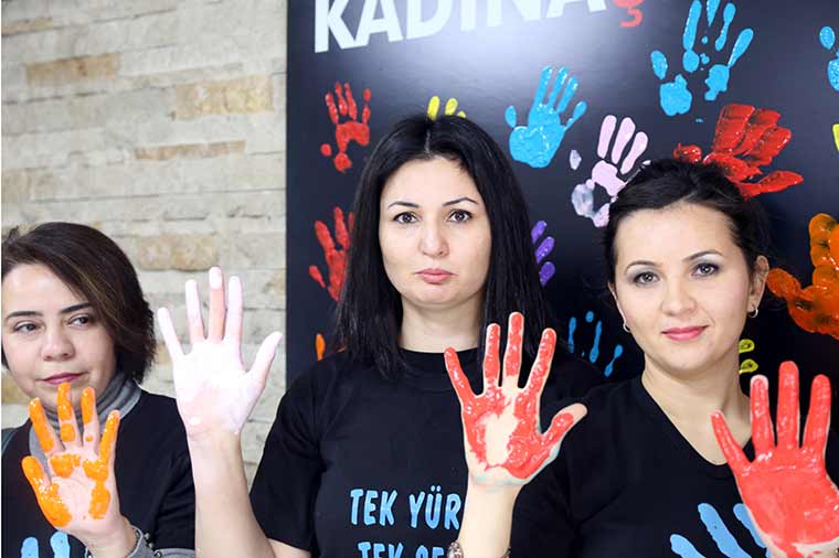 Sağlık Sen Eskişehir Şubesi Kadınlar Komisyonu üyeleri, Eskişehir Devlet Hastanesi Poliklinik girişinde hazırladıkları “Kadına Şiddete Hayır” panosuna boyalı ellerini kapıştırarak 'kadına şiddete hayır' işaretini oluşturdular.