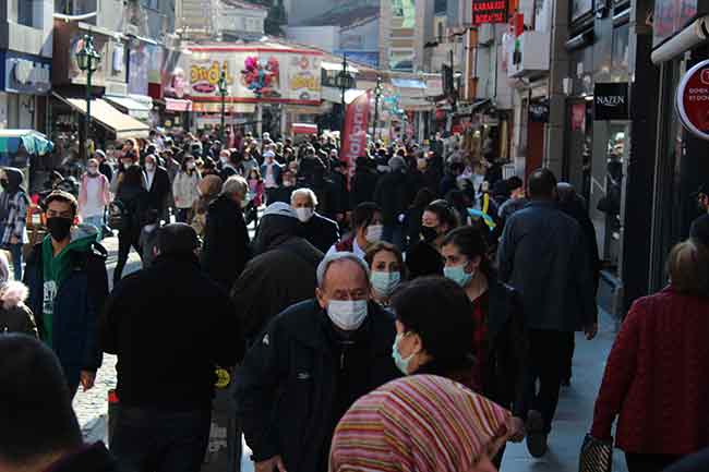 Eskişehir'de, Korona virüse (Covid-19) karşı alınan tedbirler kapsamında hafta sonu sokağa çıkma kısıtlamasının başlamasına saatler kala ortaya çıkan insan kalabalığı adeta pes dedirtti.