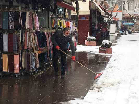 Eskişehir’de sabah saatlerinde etkili olan kar yağışı, kent merkezini beyaza bürürken, kepenk açan esnaf, dükkânının önünü küreklerle ve süpürgelerle temizledi.