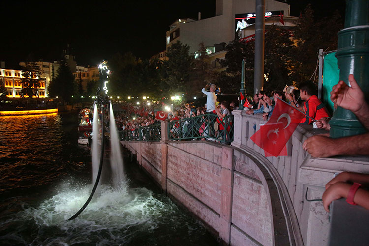 Eskişehir’in düşman işgalinden kurtuluşunun 96. yıl dönümü kutlamaları akşam Porsuk Çayı’nda düzenlenen botlarla fener alayı, havai fişek ve Flyboard gösterisi ile tamamlandı.