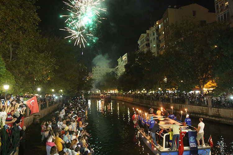 Eskişehir’in düşman işgalinden kurtuluşunun 96. yıl dönümü kutlamaları akşam Porsuk Çayı’nda düzenlenen botlarla fener alayı, havai fişek ve Flyboard gösterisi ile tamamlandı.