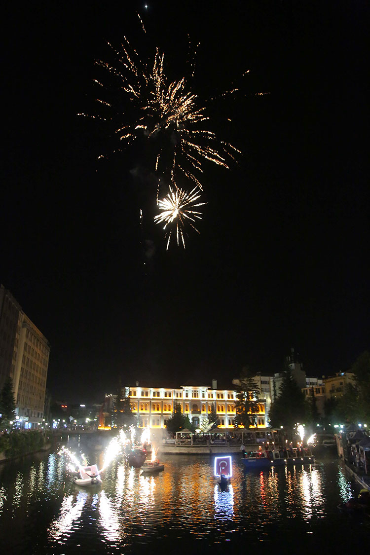 Eskişehir’in düşman işgalinden kurtuluşunun 96. yıl dönümü kutlamaları akşam Porsuk Çayı’nda düzenlenen botlarla fener alayı, havai fişek ve Flyboard gösterisi ile tamamlandı.