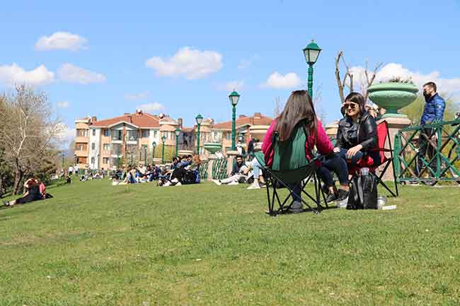 Eskişehir’de güneşli havanın etkisiyle kendisini dışarı atan vatandaşlar Covid-19 tedbirlerini adeta hiçe sayarak soluğu parklarlar birlikte Porsuk Çayı kenarında aldı.