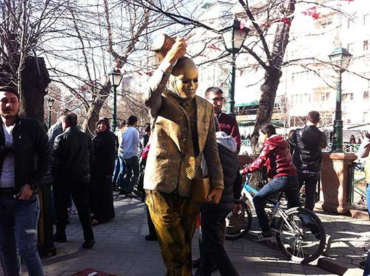 Eskişehir'de güzel havanın tadını çıkaran vatandaşlar, canlı heykel performansı ile doyasıya eğlendi.