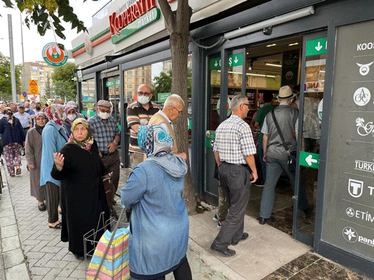 Eskişehir’de Tarım Kredi Kooperatif Marketi önünde indirimli ürünler için günün erken saatlerinde uzun kuyruklar oluşurken, vatandaşlar arasında zaman zaman sıra tartışmaları yaşandı.
