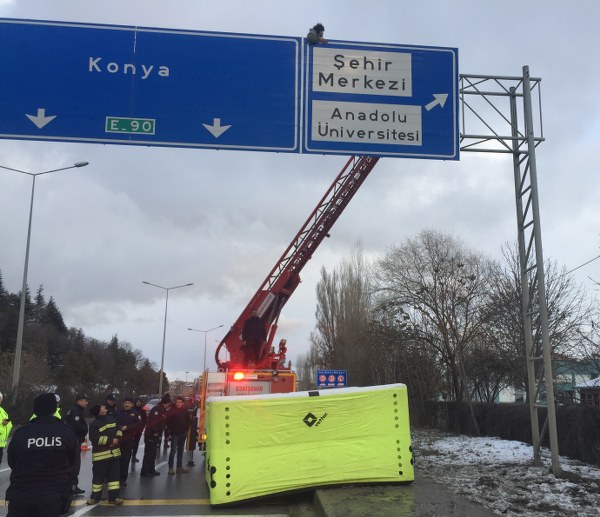 Eskişehir’de bir şahıs, çevreyolunda yön levhasına çıkarak intihar girişiminde bulundu. Tepebaşı Kaymakam Erdinç Yılmaz olay yerine gelip ‘yardım sözü’ vererek şahsı aşağı indirdi.
