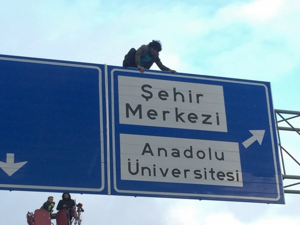 Eskişehir’de bir şahıs, çevreyolunda yön levhasına çıkarak intihar girişiminde bulundu. Tepebaşı Kaymakam Erdinç Yılmaz olay yerine gelip ‘yardım sözü’ vererek şahsı aşağı indirdi.