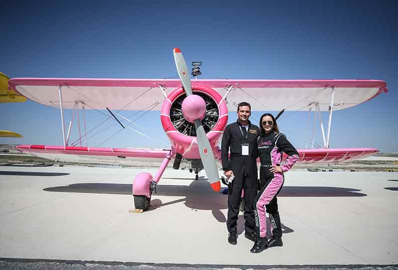 Eşinin kullandığı uçağın kanatlarında yürüyerek gösteri sunan İsviçreli Danielle Del Buono, 15 yıldan bu yana uçuş sırasında Boeing Stearman tipi uçağın kanadında yaptığı gösteriyi, Eskişehir'de de tekrarladı.