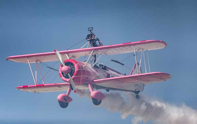 Eşinin kullandığı uçağın kanatlarında yürüyerek gösteri sunan İsviçreli Danielle Del Buono, 15 yıldan bu yana uçuş sırasında Boeing Stearman tipi uçağın kanadında yaptığı gösteriyi, Eskişehir'de de tekrarladı.