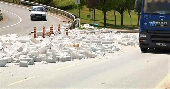 Eskişehir’de kontrolden çıkan tırın dorsesindeki tuğlalar çevreyoluna saçıldı.